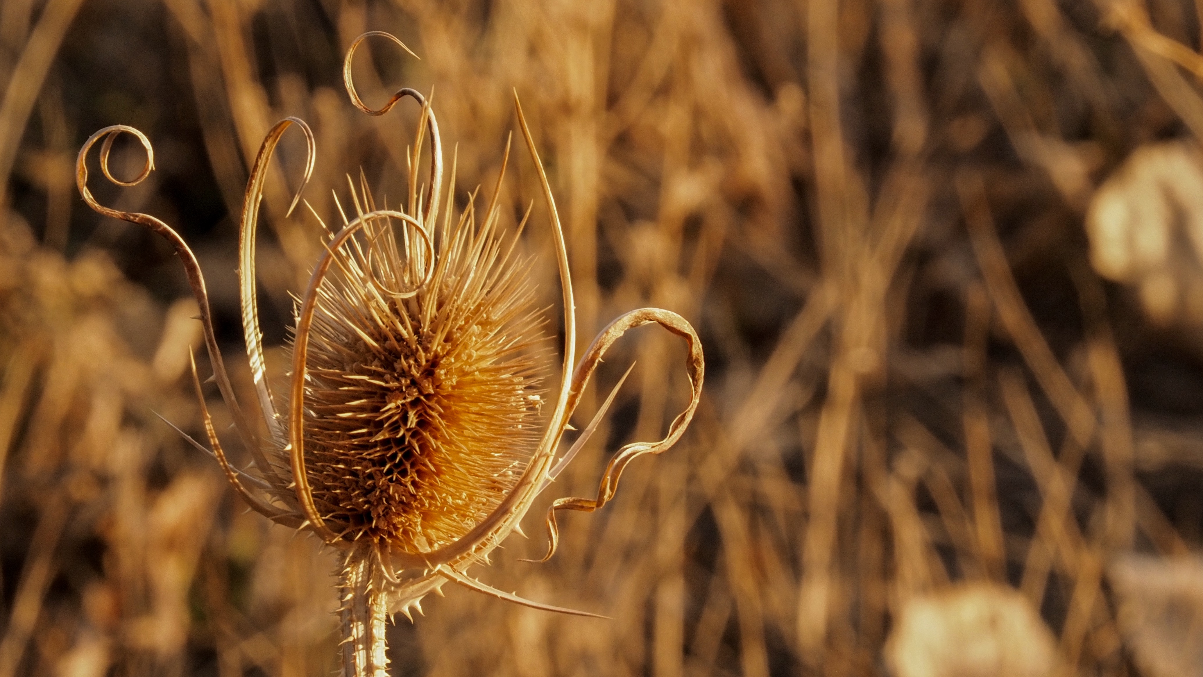Teasel is an invasive species, invading wetlands and prairies in central and eastern Colorado. It’s sharp thorns and 4-6 foot height make navigating teasel patches quite uncomfortable. Yet, in the late fall and early winter it has an endearing and attractive quality. It glows gold in the setting sun. The patterns of the upright — dare I say proud — plants are stunning: symmetric, graceful, bold and inviting. But you would not want to walk among them! This one demonstrates both the painfully sharp thorns and the delicatelly calligraphic beauty of the dried petals.